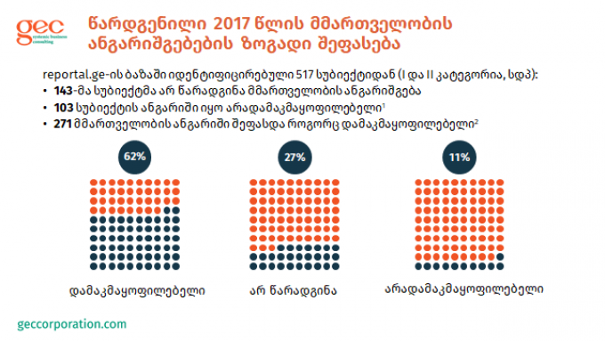 2017 წლის საანგარიშო პერიოდზე ბუღალტრული აღრიცხვის, ანგარიშგებისა და აუდიტის ზედამხედველობის სამსახურის პორტალზე, კვლევის ჩატარების მომენტისთვის სულ წარდგენილი იყო 517 წლიური ანგარიში (ფინანსური ან/და მმართველობის)